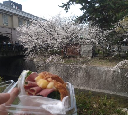 夙川公園、ベビーカー連れでもかなり行きやすく、桜も強く、パンまで当たり。